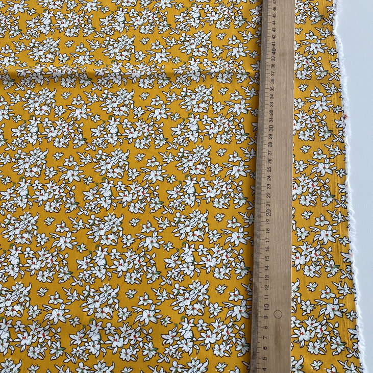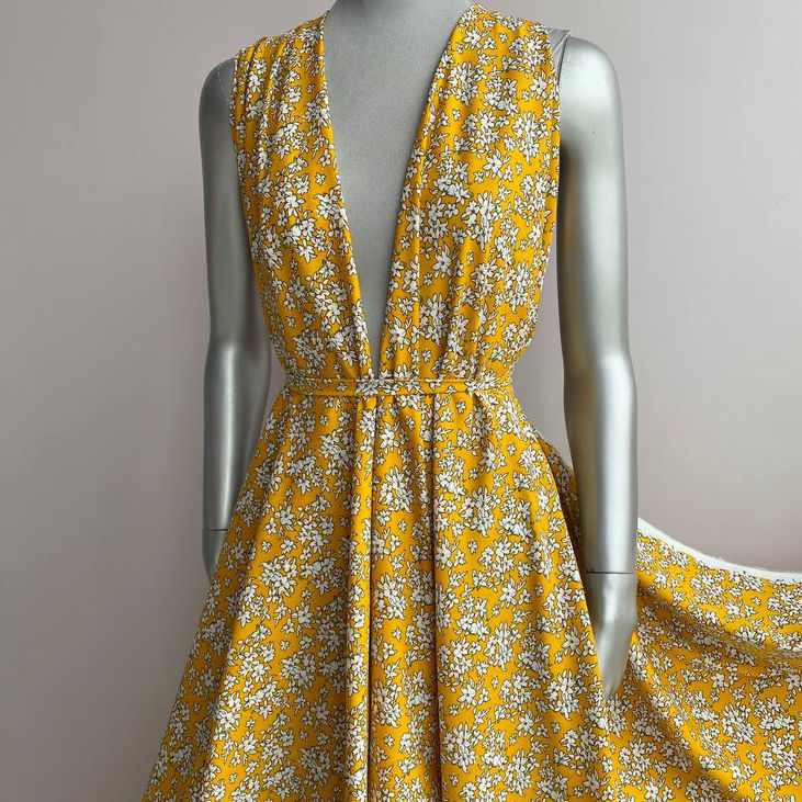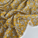 Насичений жовтий фон з ніжними білими квітами, обведеними тонким чорним контуром — це поєднання свіжості, енергії та елегантності. Легка і приємна до тіла тканина ідеально підходить для пошиття яскравих літніх речей, що дарують комфорт і стиль.