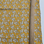 Основні переваги тканини: Натуральний склад та унікальний принт: Білі квіти з чорним контуром на жовтому фоні створюють гарний контраст і додатковий об’єм малюнку.