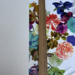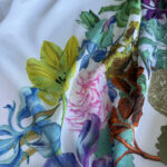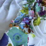 Легка і повітряна італійська шифонова тканина з виразним крупним квітковим принтом купоном на чистому білому фоні.