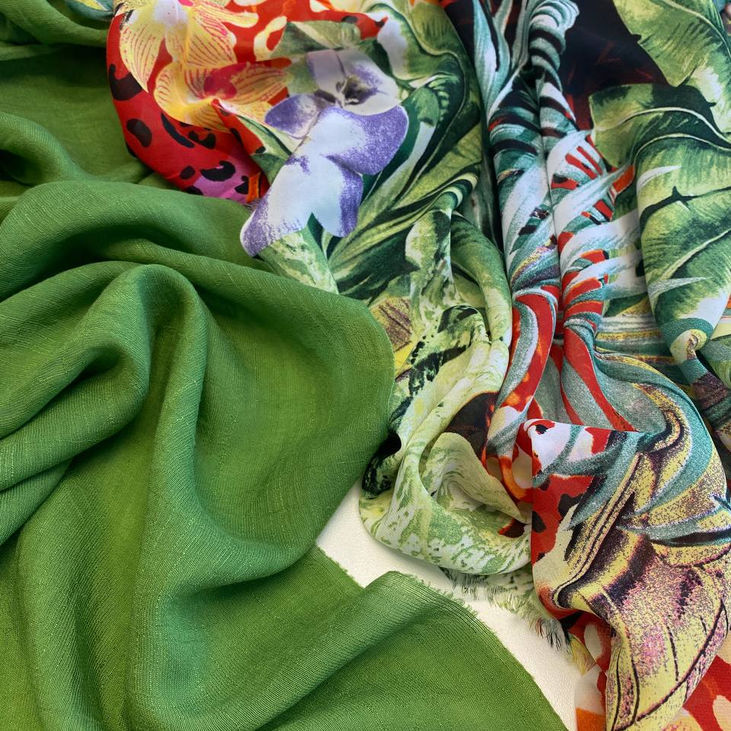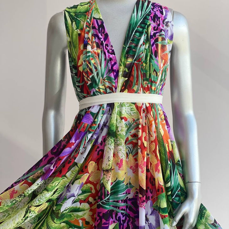 Напівпрозора, невагома тканина зі шлейфом елегантної легкості дарує відчуття свободи та літа. Принт — розкішний тропічний мікс: соковите зелене листя, яскраві екзотичні квіти та стильний animal-мотив — створює ефектну, динамічну композицію, яка миттєво приковує погляд.