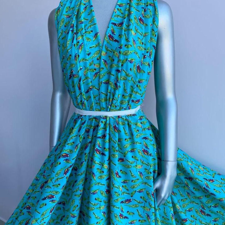 Переваги тканини: Оригінальний і барвистий принт папужок. Легка, але міцна структура креп-шифону. Чудова драпірування і комфорт у носінні. Підкреслює індивідуальність і весняно-літній настрій