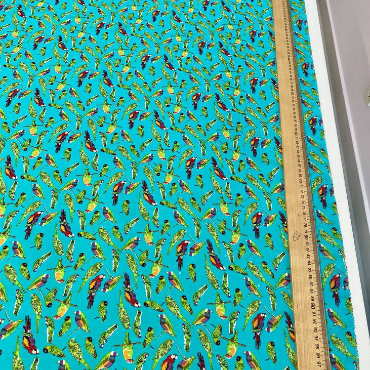 Яскравий і стильний шифон креп бірюзового кольору з веселим принтом різнокольорових папужок — ідеальна тканина для створення оригінальних і живих образів. Легка і фактурна тканина чудово тримає форму та підкреслює індивідуальність.