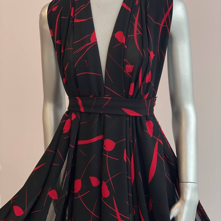 Фактура шифону-крепу додає вишуканості. Завдяки легкій зернистості поверхні тканина м’яко тримає форму, красиво драпірується, не блищить, але створює шляхетний матовий ефект. Напівпрозора, легка, але з характером — ідеальна для літнього вечора, ділового образу з “родзинкою” або мистецького виходу.
