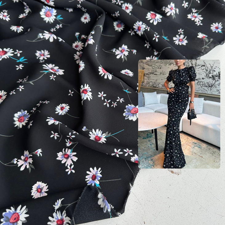 Купити шифон креп чорний з білими ромашками — прекрасний вибір для тих, хто цінує класику з сучасним акцентом. Швидка доставка по Україні і професійна консультація