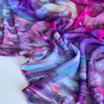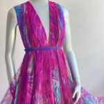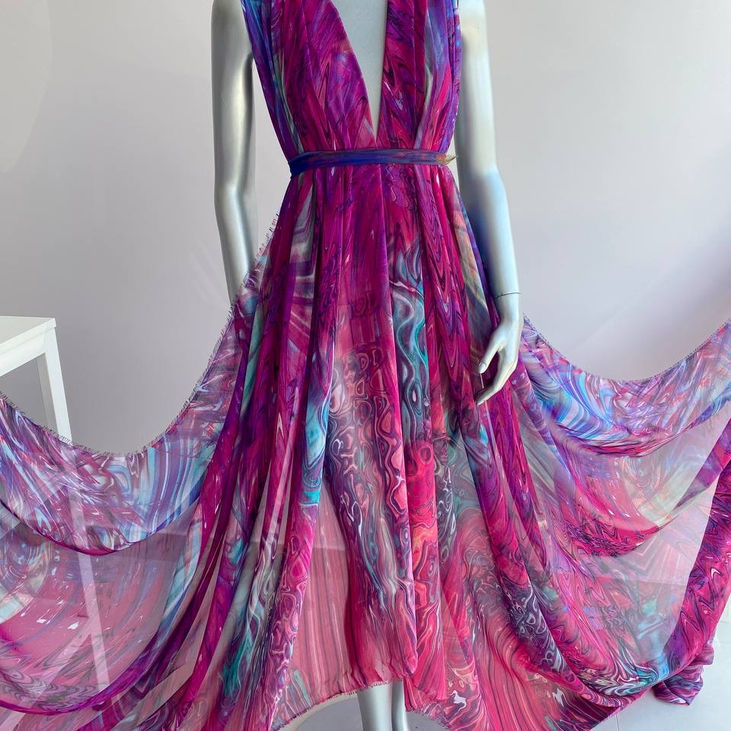 Цей шифон варто кроїти у вільному стилі, із використанням драпіровок, складів, крію по косій, щоб градієнт і абстракція розкрились у повному обсязі.
