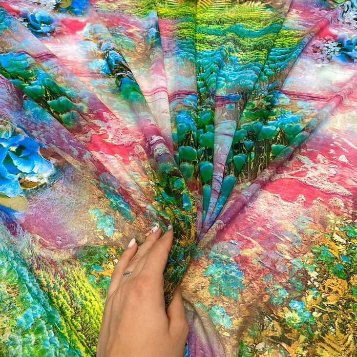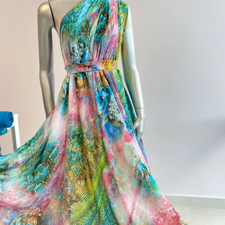 Тканина — тонкий, прозорий шифон, невагомий і повітропроникний. Вона делікатно торкається тіла, чудово драпірується, утворює м’які хвилі при русі. Цей шифон ніби створений для літа, для руху, для легких образів, які “дихають” разом із власницею.
