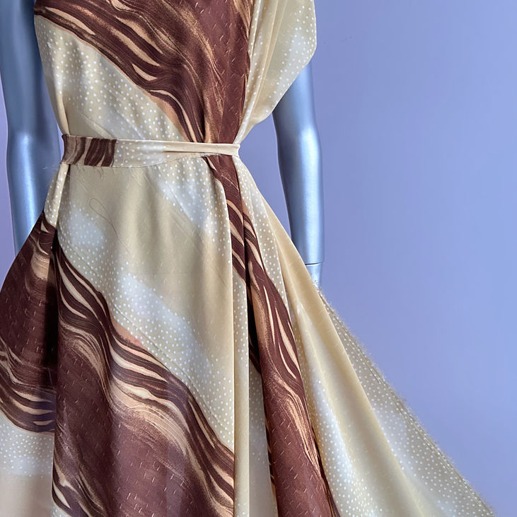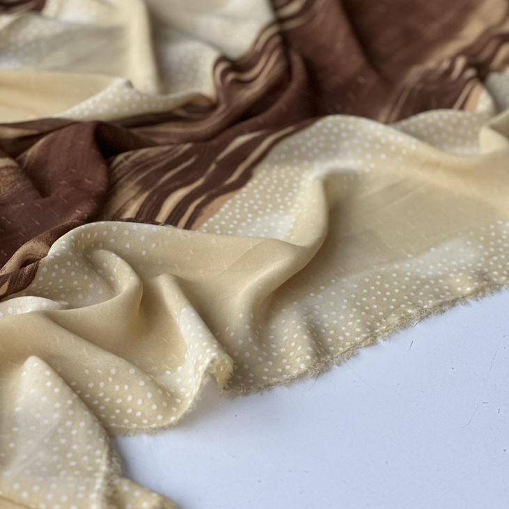 Основний бежевий фон м’яко обрамлює складний, багатоколірний принт: витончені коричнево-рижі мотиви, ніби осіннє листя, переплітаються із соковитими зеленими стрічками, а світлі горошки надають свіжості та легкого ретро-настрою.