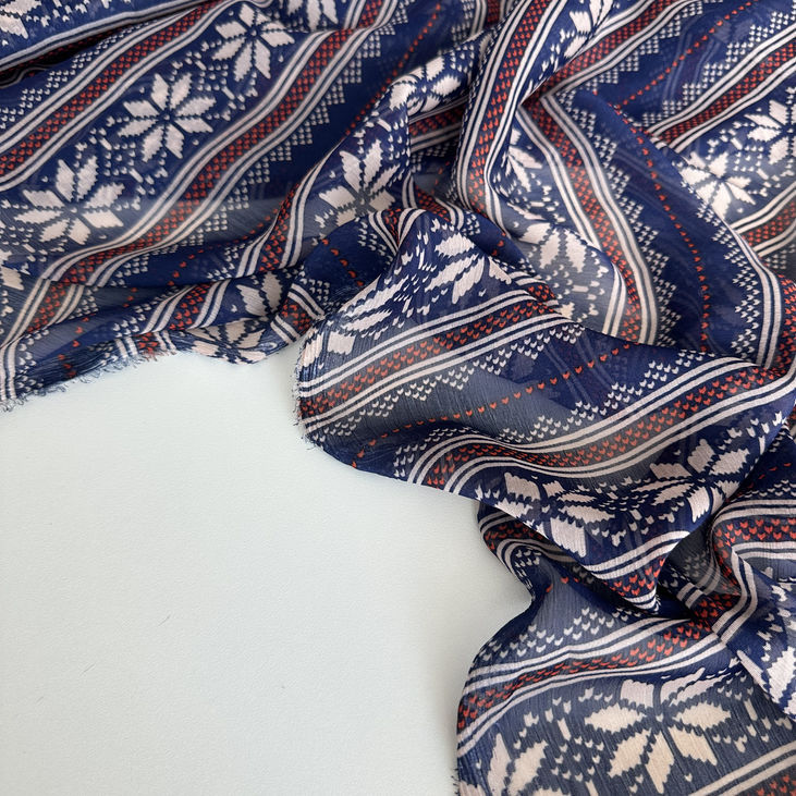Стильний і оригінальний шифон з етно принтом, доповненим графічними сніжинками на ніжному синьо-блакитному фоні. Ця тканина створить атмосферу зимового затишку та підкреслить унікальність вашого образу, ідеальна для святкового і повсякденного одягу.