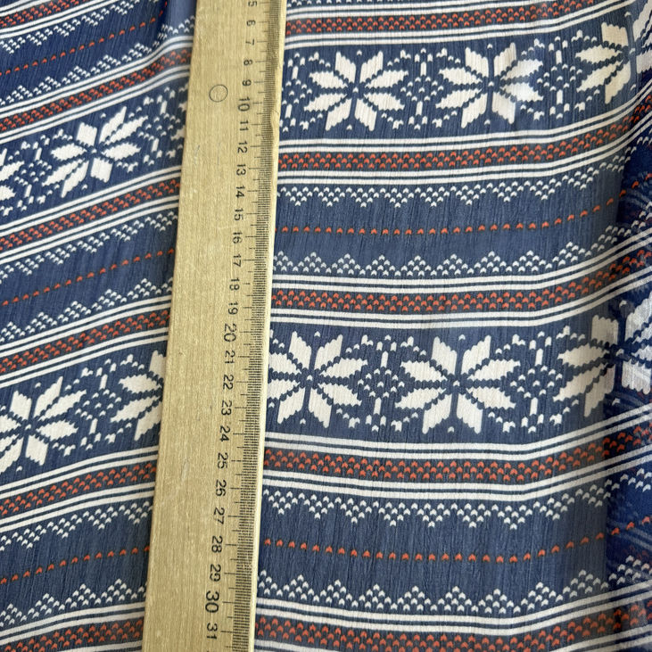 Переваги тканини: Унікальний етно дизайн із зимовою тематикою. Легка, повітряна, приємна до тіла тканина. Чудова драпіровка для створення ефектних образів. Підкреслює індивідуальність і святковий настрій