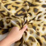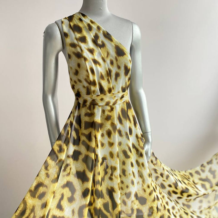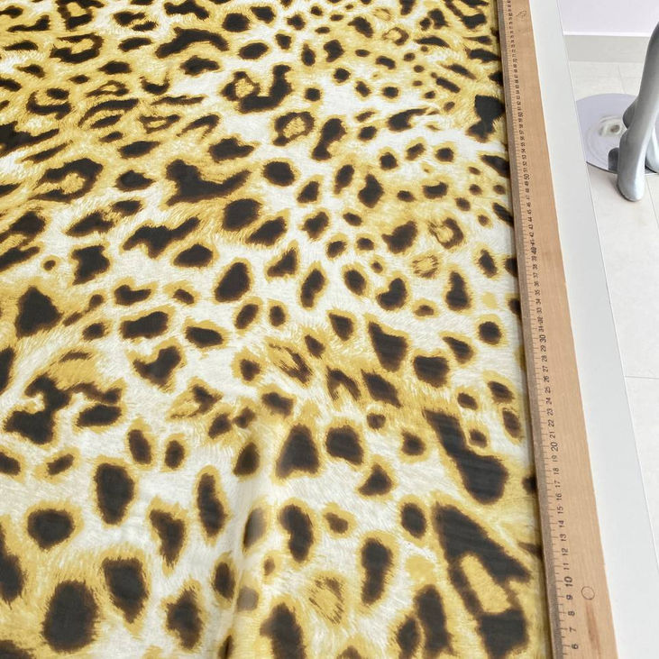 Легкий, майже невагомий шифон з фантазійним леопардовим принтом — це про свободу, про літо, про грайливий настрій. Жовто-коричнева палітра виглядає тепло й стильно, а світлий фон додає свіжості й повітря.