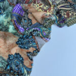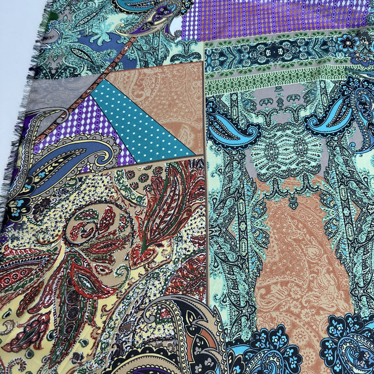 Принт — фантазійне поєднання кількох декоративних мотивів: класичний “огірок” (пейслі), дрібні горошки й стилізація під печворк — все це зібране у складну композицію на основі ніжної бірюзово-лілової гами з акцентами зеленого та коричневого.