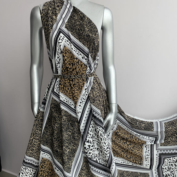 Легкий та стильний шифон з комбінованим принтом у трендовій коричнево-чорно-білій гамі — це поєднання дикої природи та геометричної гармонії. Тканина прикрашена animal-принтом , плавно інтегрованим із графічними елементами, що додає глибини та модного акценту будь-якому образу.