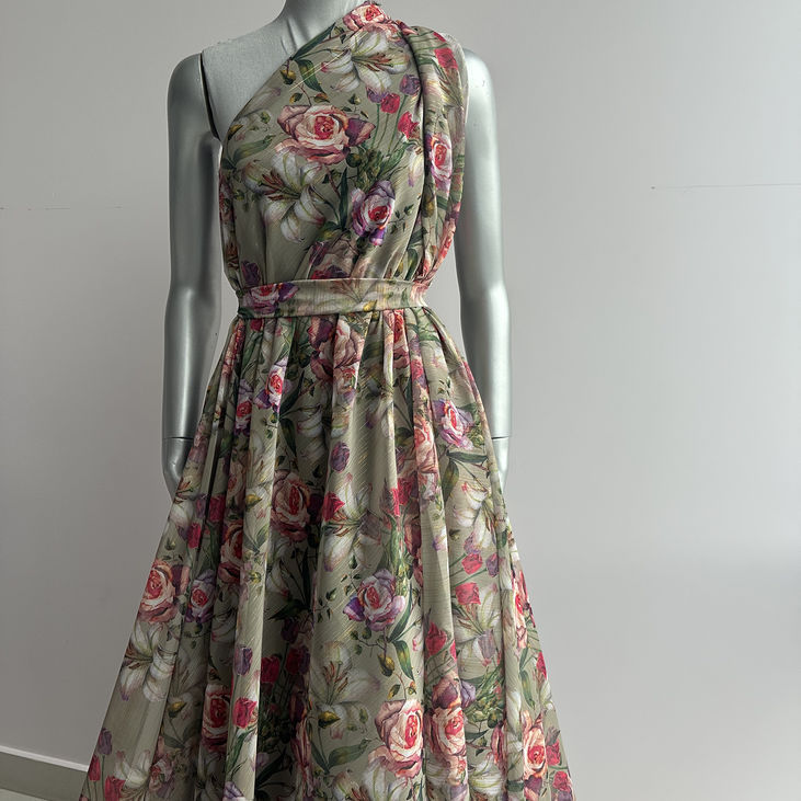 Це шифон для жінки, яка вміє бачити красу в нюансах: у переливі світла, у тіні між пелюстками, у м’якому русі тканини на вітрі. Фактура напівпрозора, але з характером, тримає форму делікатно, драпірується плавно, не липне до тіла. Кожна складка ніби оживає завдяки 3D-ефекту квітів.