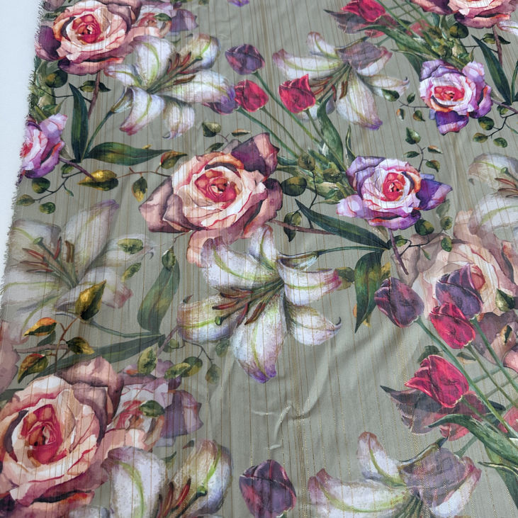 Купити шифон з акварельними квітами 3D на фоні хаки з люрексом — відмінний вибір для створення унікальних, яскравих і вишуканих речей.