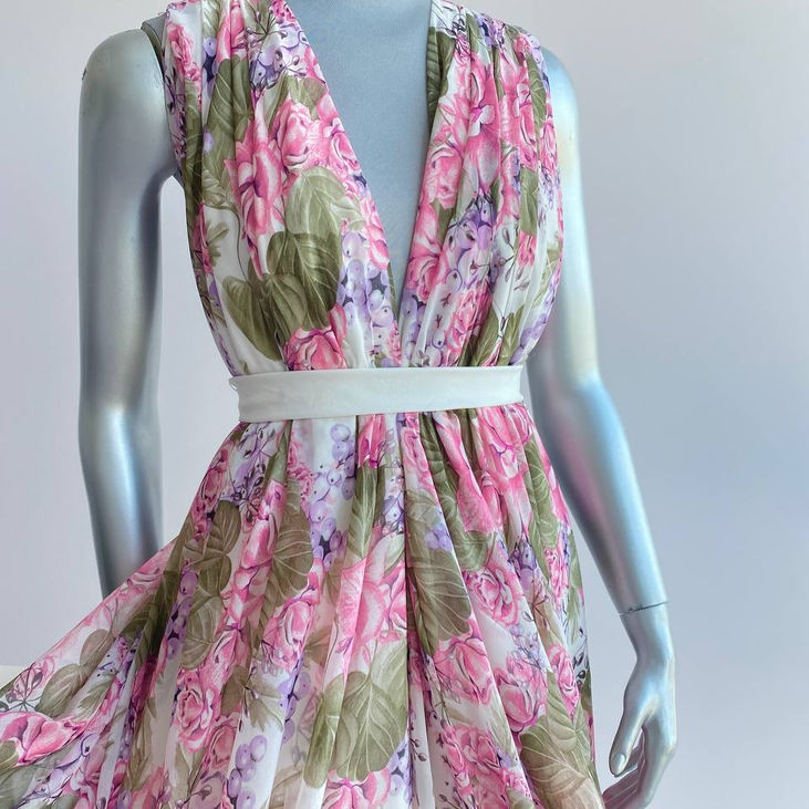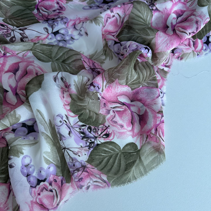 Легкий і романтичний шифон з витонченим принтом рожевих квітів, листя хакі і дрібних ягідок у ніжній пастельній кольоровій гамі. Ідеальна тканина для створення жіночних, легких та стильних образів з природною свіжістю і гармонією.