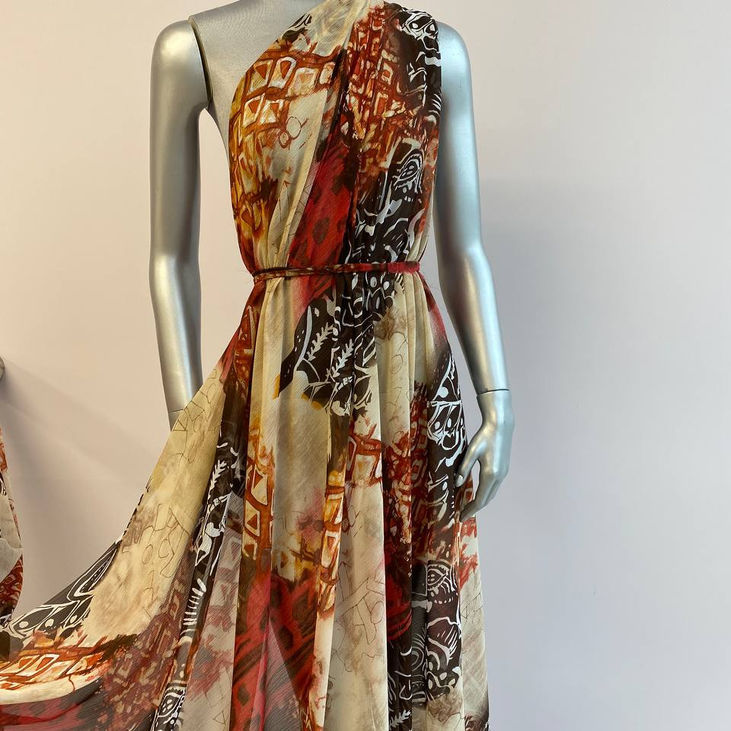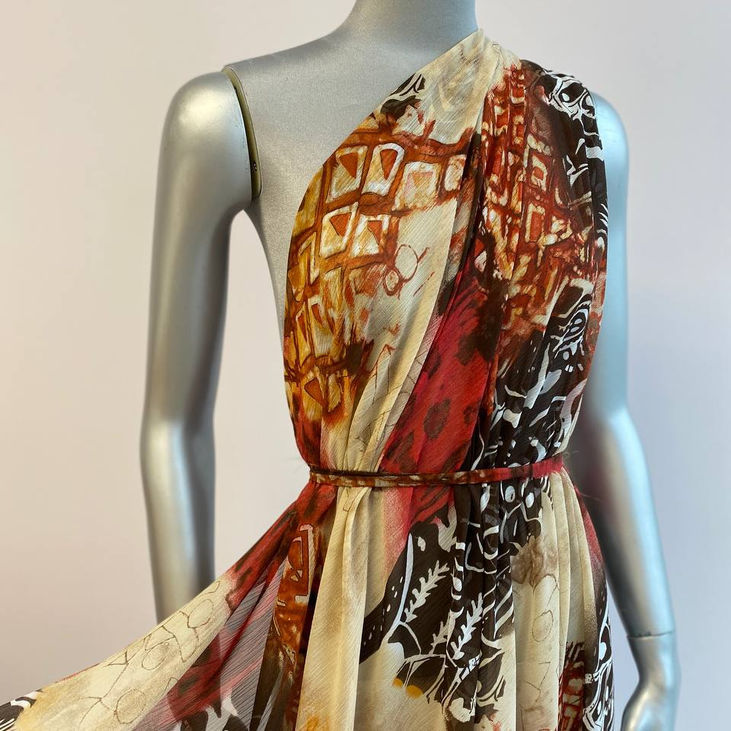 Переваги тканини : Тканина майже невагома, легка, напівпрозора. Її приємна, шовковиста текстура дарує тілу комфорт, дихає разом із шкірою, не парить, не прилипає — ідеальна для літньої спеки. Шифон легко драпірується, м’яко лягає у складки, не ламається, не додає зайвого об’єму, а рухається в ритмі вашого кроку.