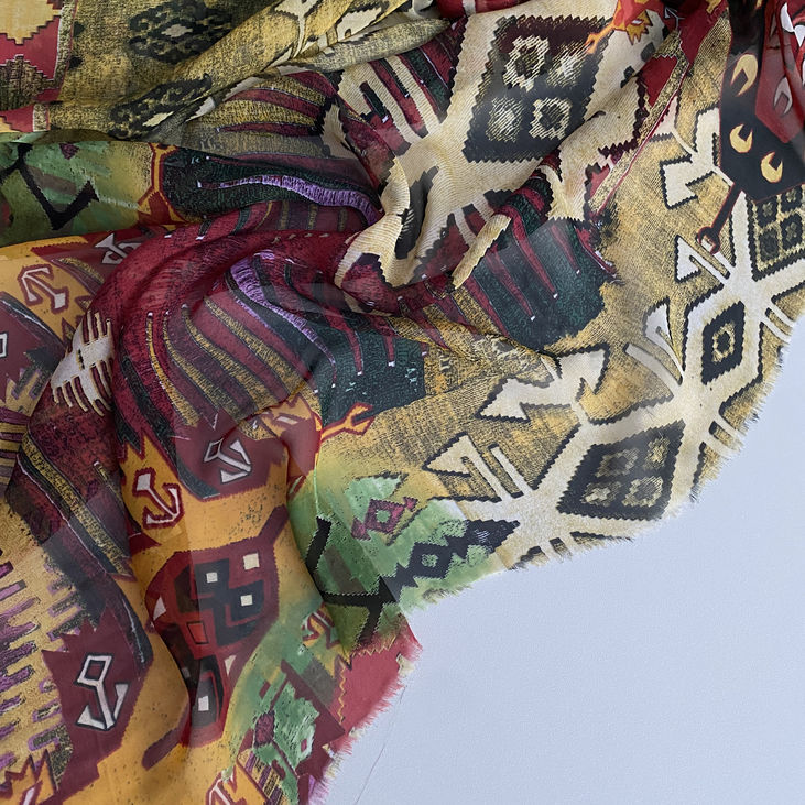 Шифон зі скандинавським етно-принтом у зелено-коричнево-червоній гамі на жовтому фоні