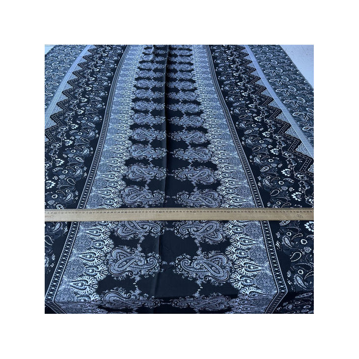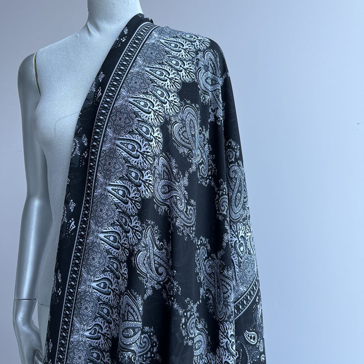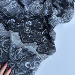 На глибокому чорному фоні розгортається стильний принт у дусі Zimmermann: складні “огіркові” мотиви поєднуються з графічними елементами у благородній сірій гамі, нагадуючи тонку вишивку чи гравюру на тканині. Виглядає це розкішно, стримано, з легкою ретро-ноткою і сучасною графічною точністю.