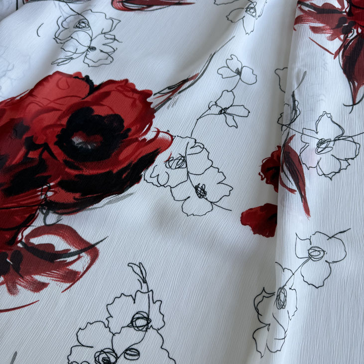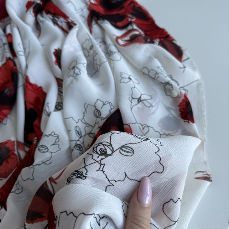 Розкішний італійський віскозний шифон білого кольору з ефектним принтом великих акварельних маків — ідеальна тканина для створення легких, повітряних і візуально виразних речей.