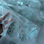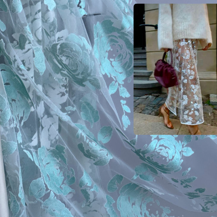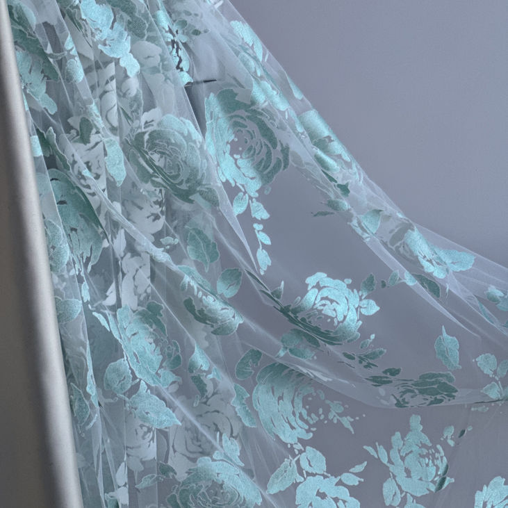 Переваги тканини: Ефектна напівпрозорість — ідеальна для святкових, вечірніх, весільних образів. Оксамитовий декор — трендовий акцент, який додає розкоші та текстурності. Колір тіфані — вишуканий, модний і освіжаючий; виглядає дорого і ніжно