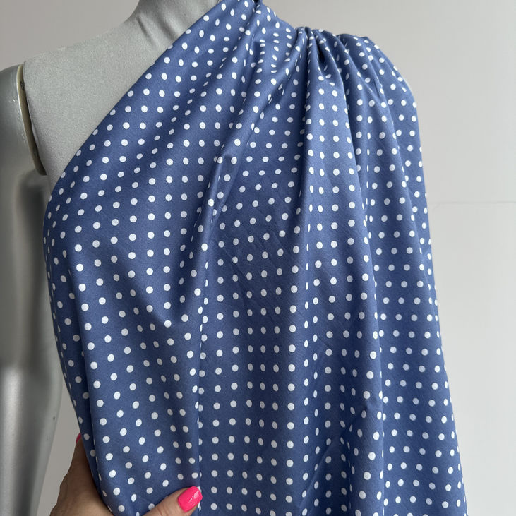 Цей стрейч котон синьо-блакитного відтінку з білими горошками діаметром 4 мм — ідеальна тканина для створення ніжного, повітряного і стильного одягу. Поєднання прохолодних тонів синього та блакитного з класичним білим горохом створює універсальний і трендовий принт, який підкреслює легкість і свіжість образу.