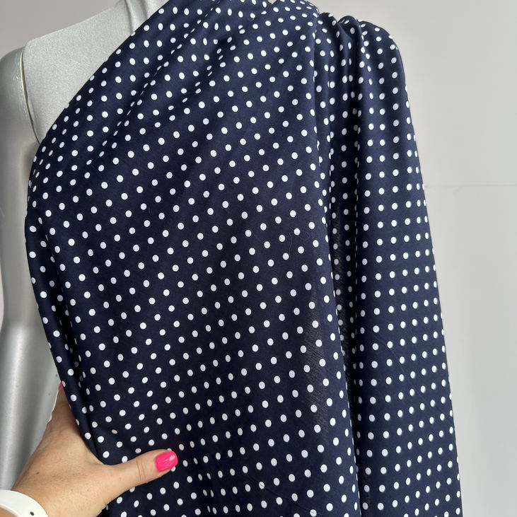 Глибокий темно-синій фон створює атмосферу стабільності та елегантності, а чіткі білі горошки діаметром 4 мм надають тканині легкості, грайливості та легкого вінтажного шарму.