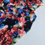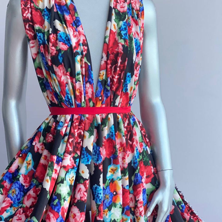 Рекомендації: Ця тканина чудово виглядає як у простих фасонах, так і в більш складних кроях із декоративними елементами: рюшами, драпіровками, асиметрією. Прекрасно поєднується з аксесуарами та взуттям у чорному, червоному, синьому або білому кольорах