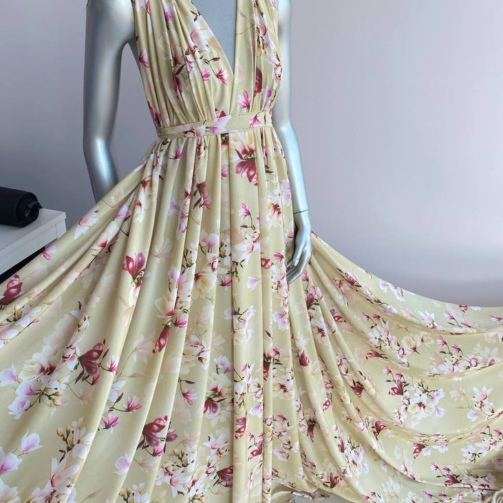 Тканина не просвічує, чудово драпірується та має природну еластичність, що робить її ідеальним вибором для речей, які мають бути не лише гарними, а й зручними у повсякденному житті.