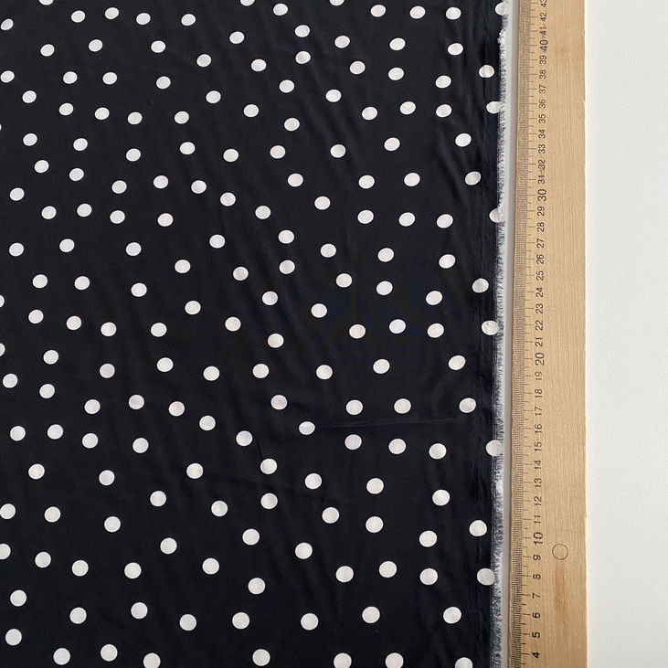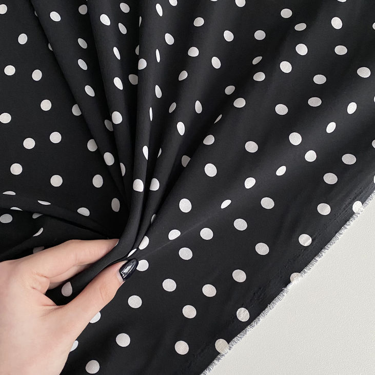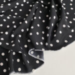 Елегантна класика, яка завжди залишається в тренді — саме так можна охарактеризувати цю тканину. Глибокий чорний фон створює витончений і стриманий настрій, а білі горошки діаметром 1 см додають образу динаміки, легкості та шарму. Це поєднання — символ жіночності та стилю, що перегукується з вінтажними настроями 50-х у сучасному прочитанні.