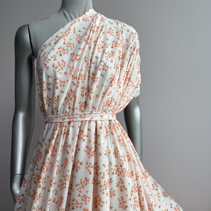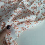 Рекомендації: Така тканина особливо гарно виглядає в кроях із м’якими лініями — з рукавами-ліхтариками, воланами, підрізами під грудьми чи з плісуванням. Вона чудово поєднується з нюдовими, молочними, карамельними, бежевими або світло-рожевими відтінками в образі.