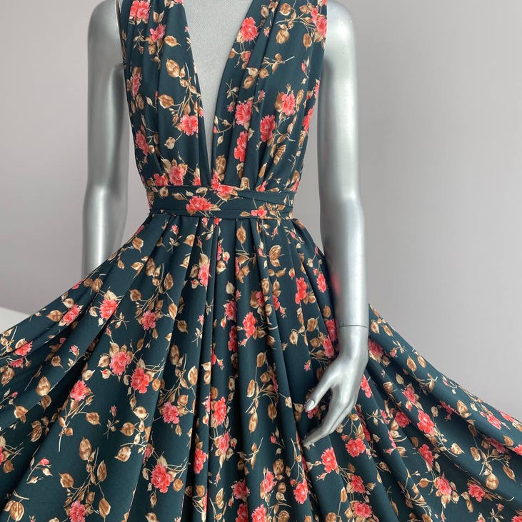 Він не просвічує, чудово драпірується, має приємну щільність і природну еластичність, завдяки чому ідеально підходить як для повсякденного, так і для ошатного одягу. Матеріал добре тримає форму, не вибагливий у догляді та має витончений вигляд без блиску.