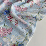 Ніжна та легка тканина суперсофт з романтичним принтом — тоненькі рожеві квіточки та витончені стрекозки на ніжно-блакитному фоні.