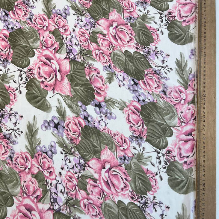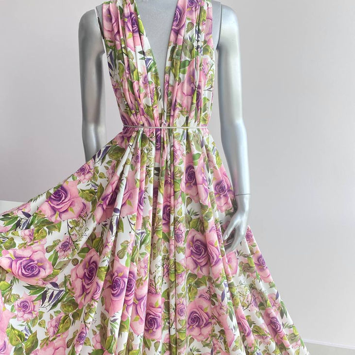 Такий квітковий принт додає образу романтичності, свіжості та елегантності. Ідеально підходить для пошиття суконь, блуз, сарафанів, спідниць або легких костюмів.
