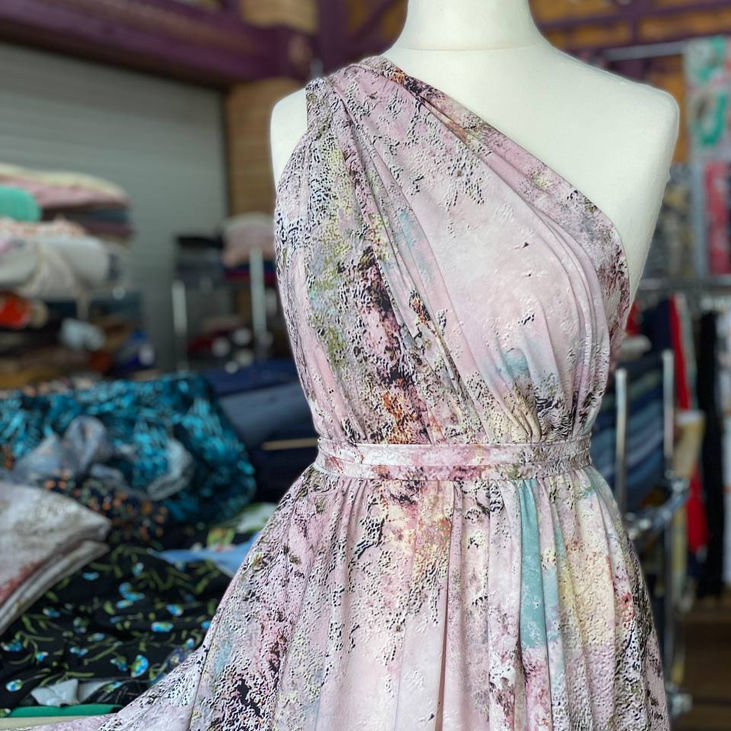 Матеріал неймовірно приємний до тіла, м’який, невагомий, з матовим фінішем. Він легко драпірується, не просвічує, має гарну посадку в різних фасонах.