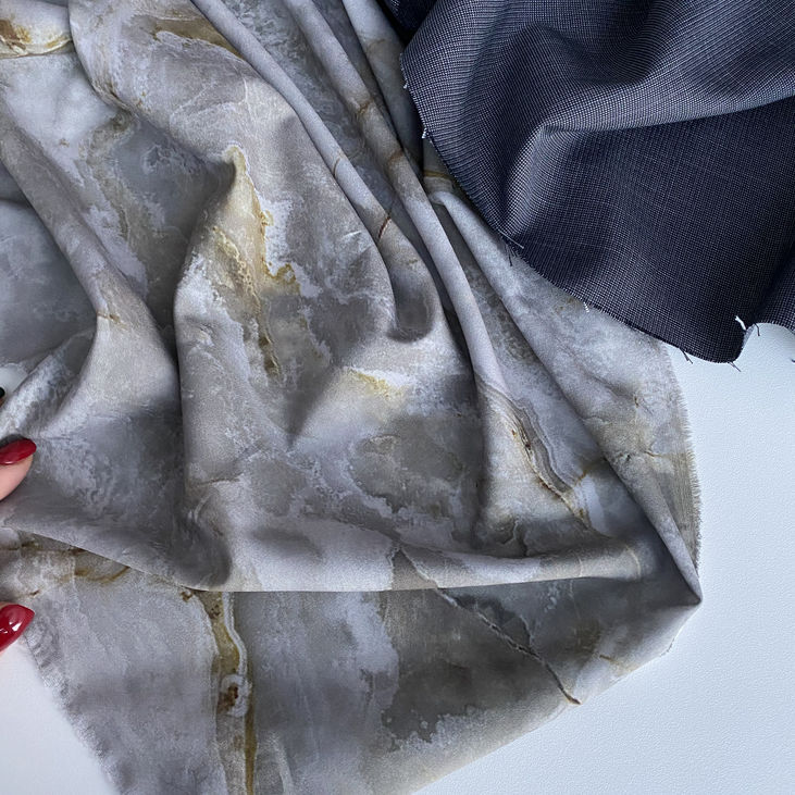 Тканина має приємну шовковисту текстуру, не просвічує, добре драпірується, забезпечує максимальний комфорт у носінні. Матова поверхня додає їй глибини та м’якості, а ефект акварелі створює візуальну легкість і витонченість. Цей суперсофт прекрасно підійде як для вільних силуетів, так і для романтичних образів.