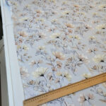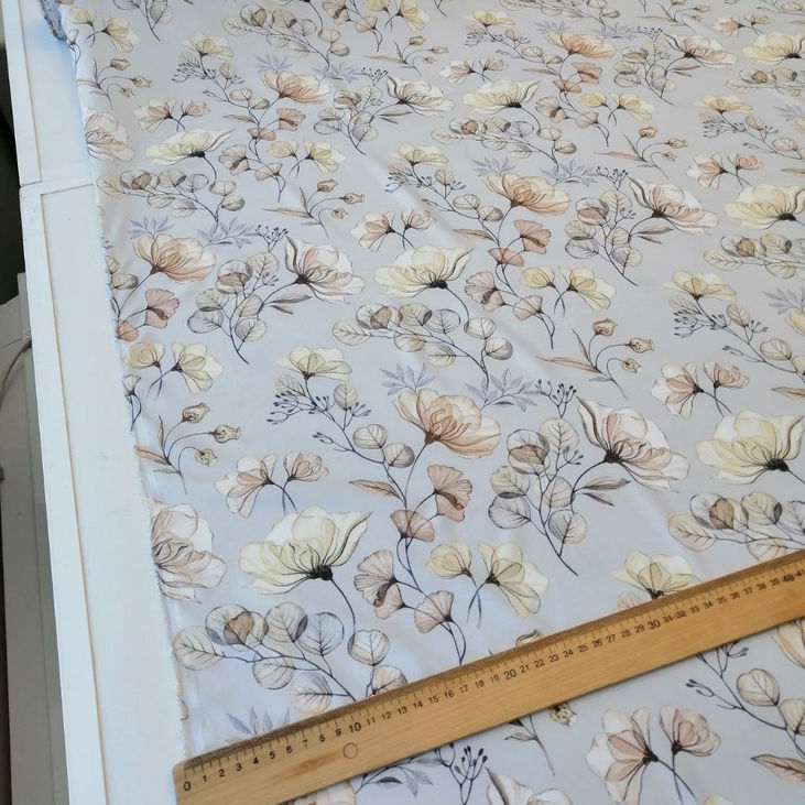 Витончена тканина суперсофт зі стриманим і стильним дизайном — бежево-коричневі квіти, виконані в техніці тонкої акварельної прорисовки, делікатно розміщені на елегантному світло-сірому фоні.