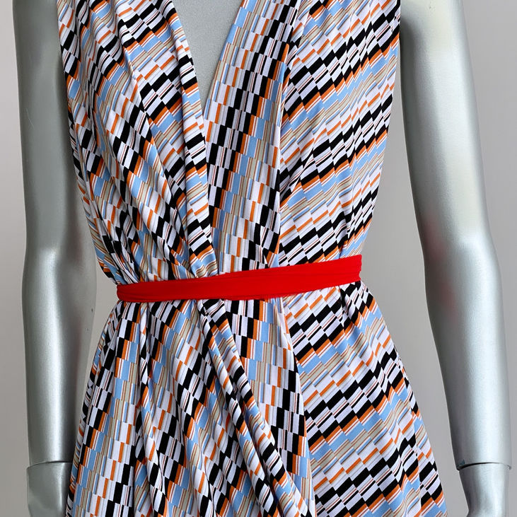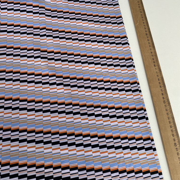 На світлому фоні розгортається динамічний графічний принт у вигляді зигзагів, виконаний у виразних кольорах: блакитному, помаранчевому та чорному.