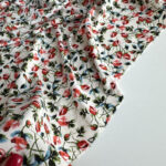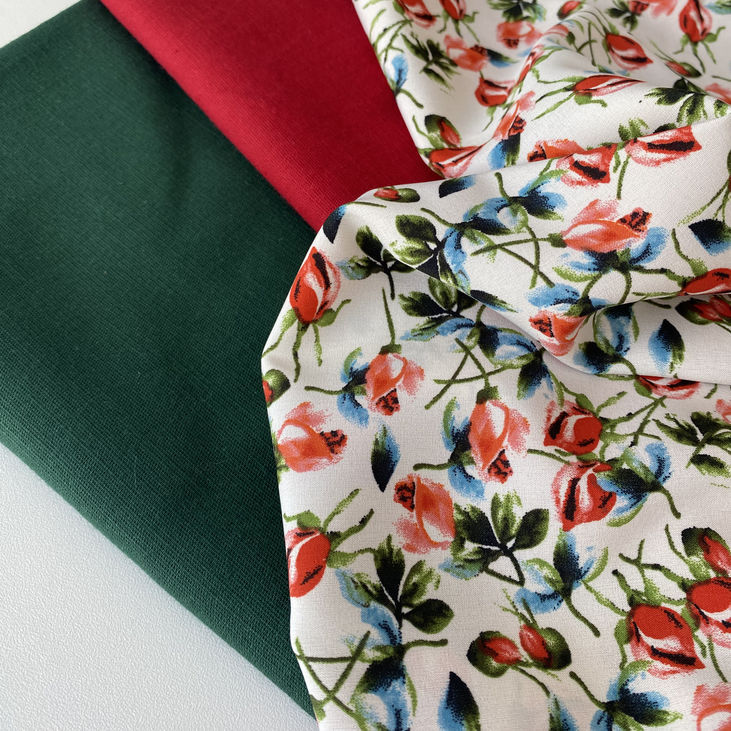 Ніжна і легка тканина суперсофт з привабливим принтом — соковиті червоні ягідки шипшини та свіжі зелені листочки на ніжному молочному фоні.