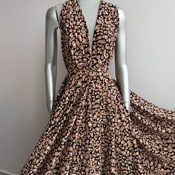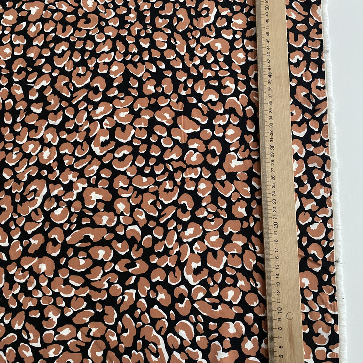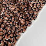 Дизайн тканини базується на глибокому чорному фоні, який підкреслює коричневі ляпки у стилі лео — виразні, але вишукані.
