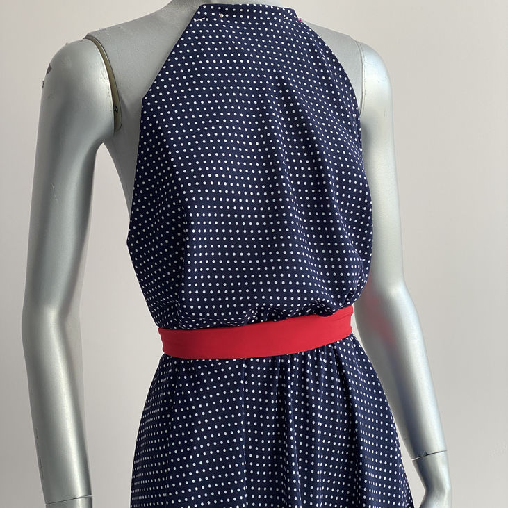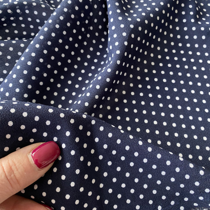 Легка, м’яка та приємна на дотик тканина має гладку, матову поверхню, яка чудово драпірується й лягає по фігурі. Її прикрашає дрібний принт — білі крапочки діаметром 1,5 мм.