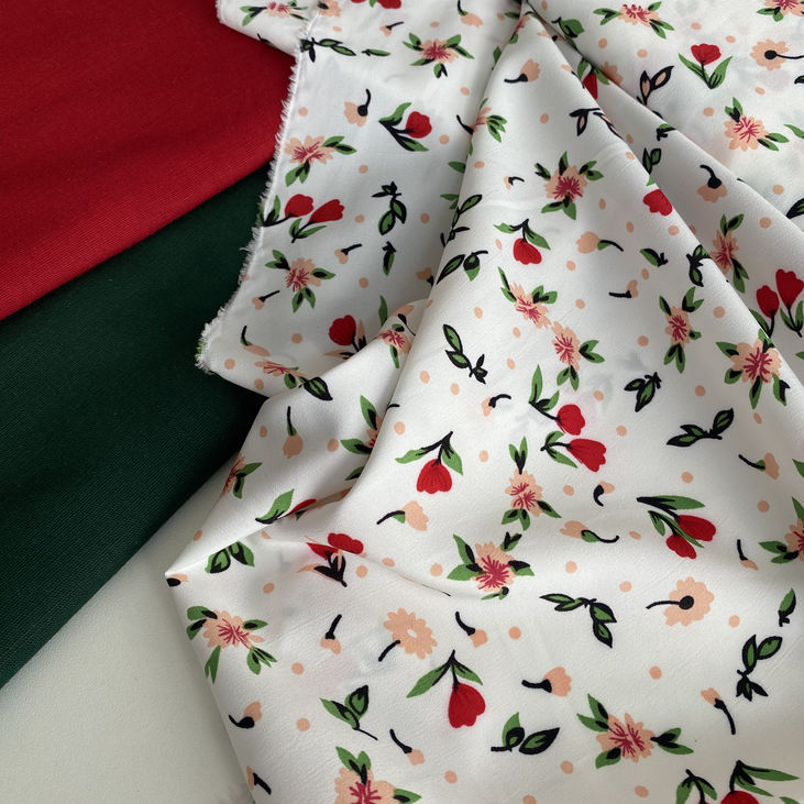 Ніжна та легка тканина суперсофт з витонченим дрібним принтом — маленькі червоні бутончики квітів і свіжі зелені листочки створюють гармонійний, природний малюнок. Ідеально підходить для пошиття романтичних суконь, блуз, тунік і дитячого одягу.