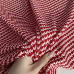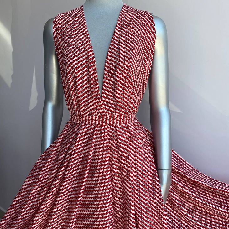 На білому, чистому фоні ніби вишиті дрібні темно-червоні графічні елементи — вони створюють витончений ритм, привертають погляд, але не перевантажують образ.