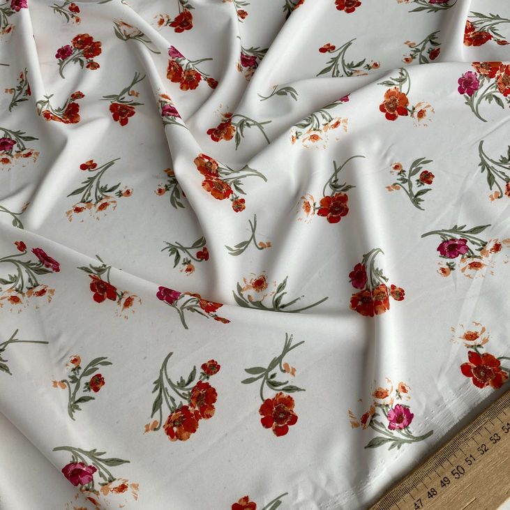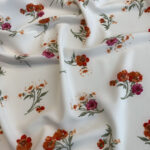 Легка та м’яка тканина суперсофт з елегантним принтом — рідко розташовані теракотово-червоні квіти та ніжне зеленкувате листя на ніжному молочному фоні.