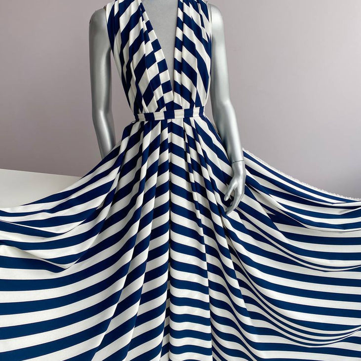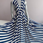 Стилістичні поради: Ця тканина чудово виглядає з аксесуарами в червоному, бежевому або золотистому кольорах. Взуття на танкетці, плетені сумки, капелюхи або сережки в морському стилі