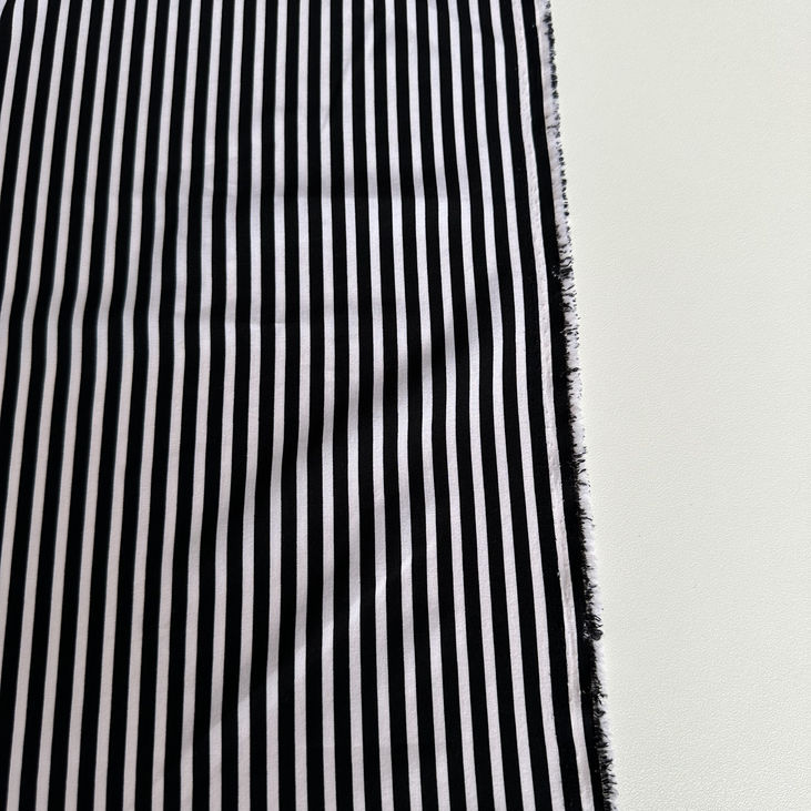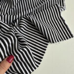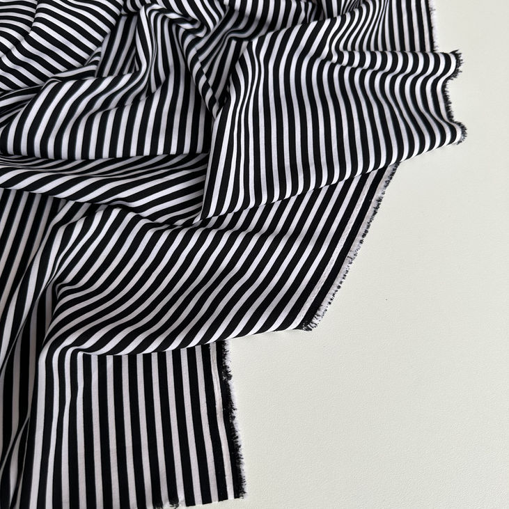 Легка, м’яка на дотик тканина суперсофт з класичним візерунком вертикальної чорно-білої смужки шириною 3–4 мм — це ідеальне рішення для створення стильного, елегантного та візуально витягнутого силуету.
