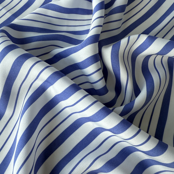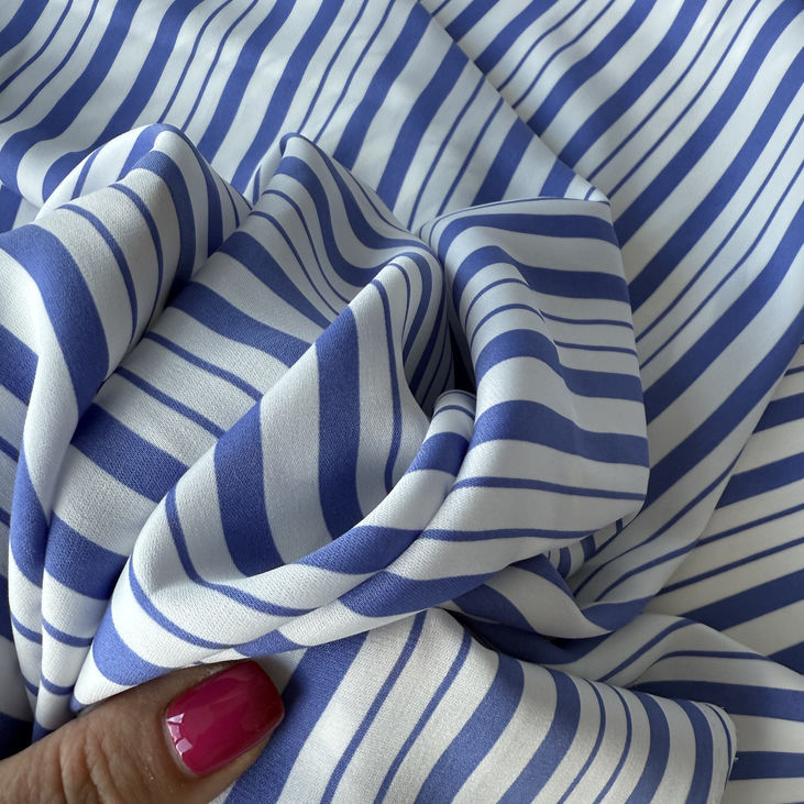 Вертикальні смужки різної ширини у відтінках блакитного делікатно витягують силует, додають образу легкості, свіжості та витонченості.