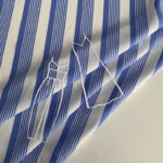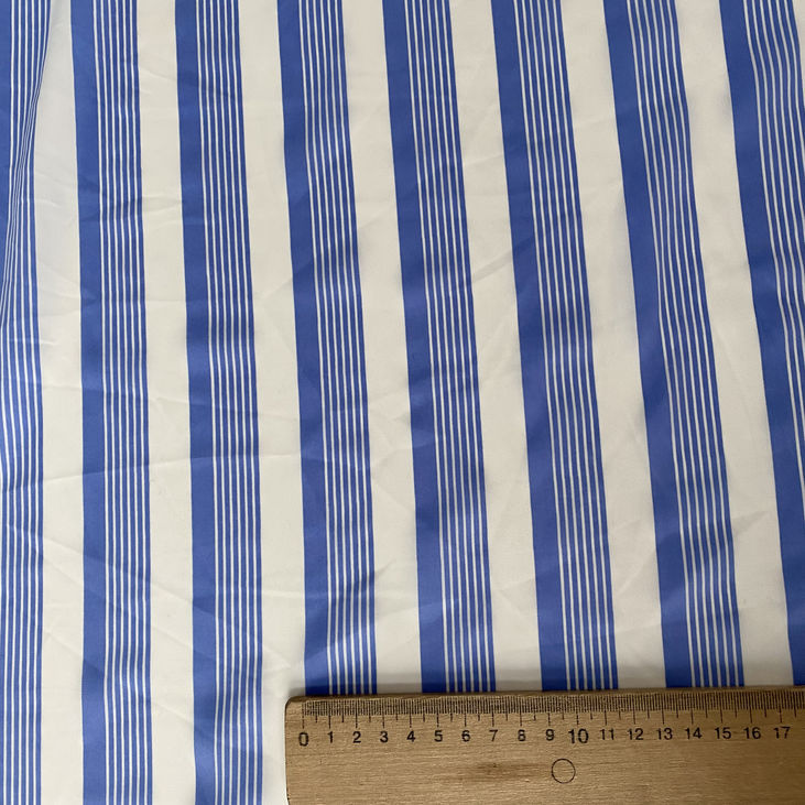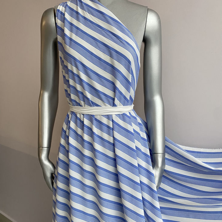 Принт виконаний у вигляді вертикальних блакитних смужок шириною 3 мм і 9 мм, що нагадують штрихкод, на ніжному біло-молочному фоні. Така комбінація створює стильний і свіжий образ, а вертикальні лінії візуально витягують силует.