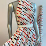 На делікатному біло-молочному фоні ритмічно розташовані вертикальні розчерки насиченого червоного та глибокого чорного кольорів, шириною близько 1 см.