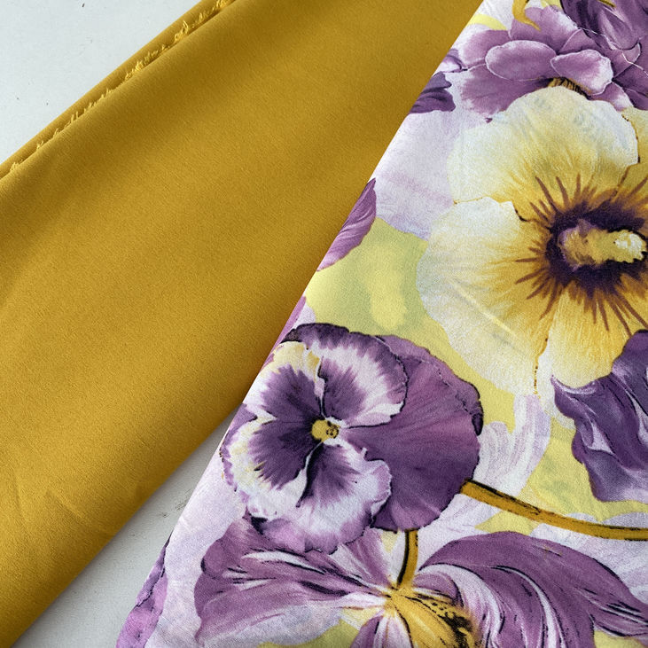 Легка, м’яка та комфортна тканина суперсофт з яскравим, але витонченим принтом — жовто-лілові анютині глазки, виконані в стилі абстракції.
