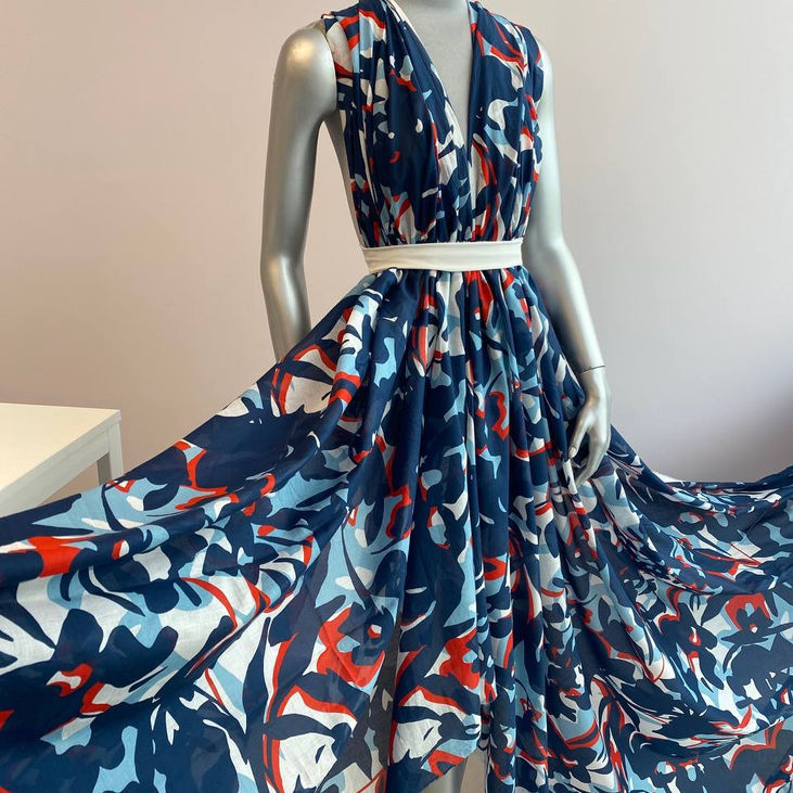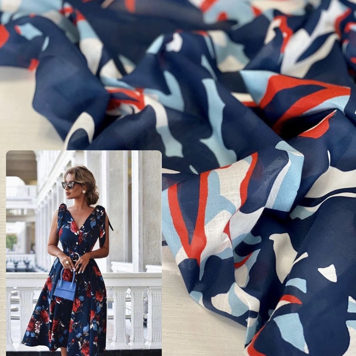 Італійський батист з унікальним абстрактним принтом у гармонійному поєднанні синього, блакитного та червоного кольорів.